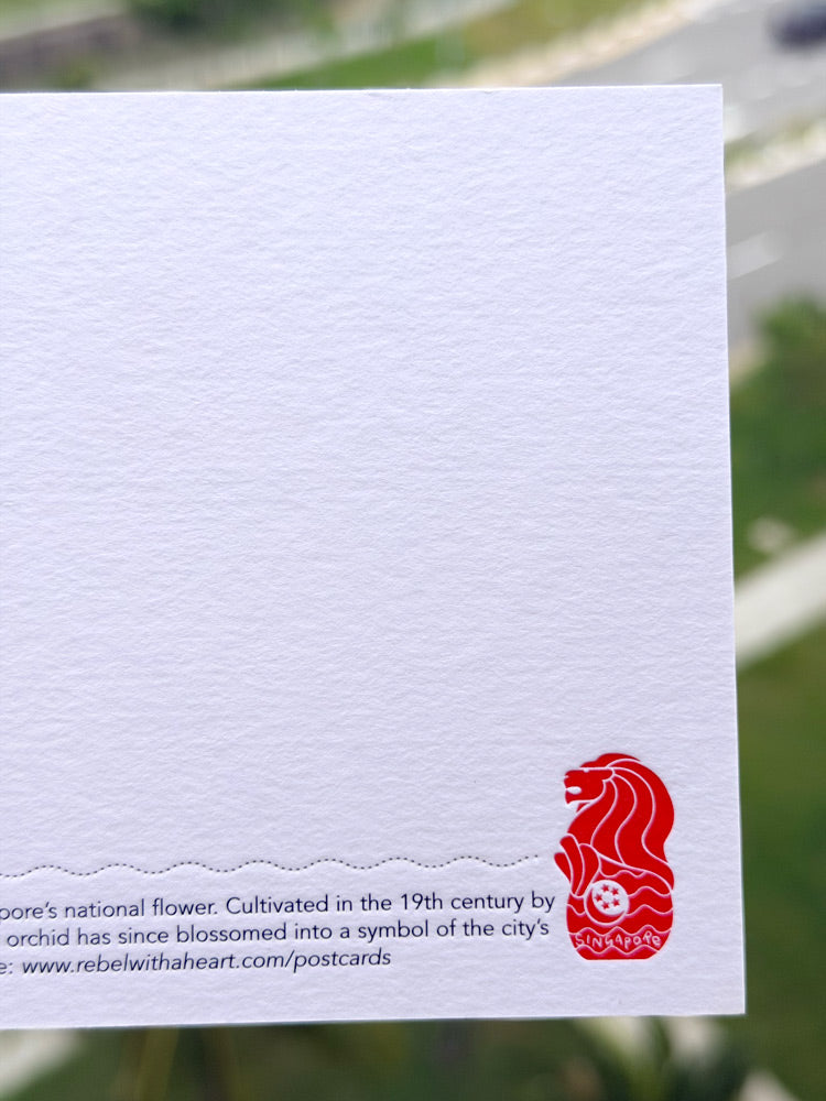 Inspired by Batik - a regional textile art made with wax-resist dyeing, this illustrated card features Singapore's national flower Vanda Miss Joaquim.