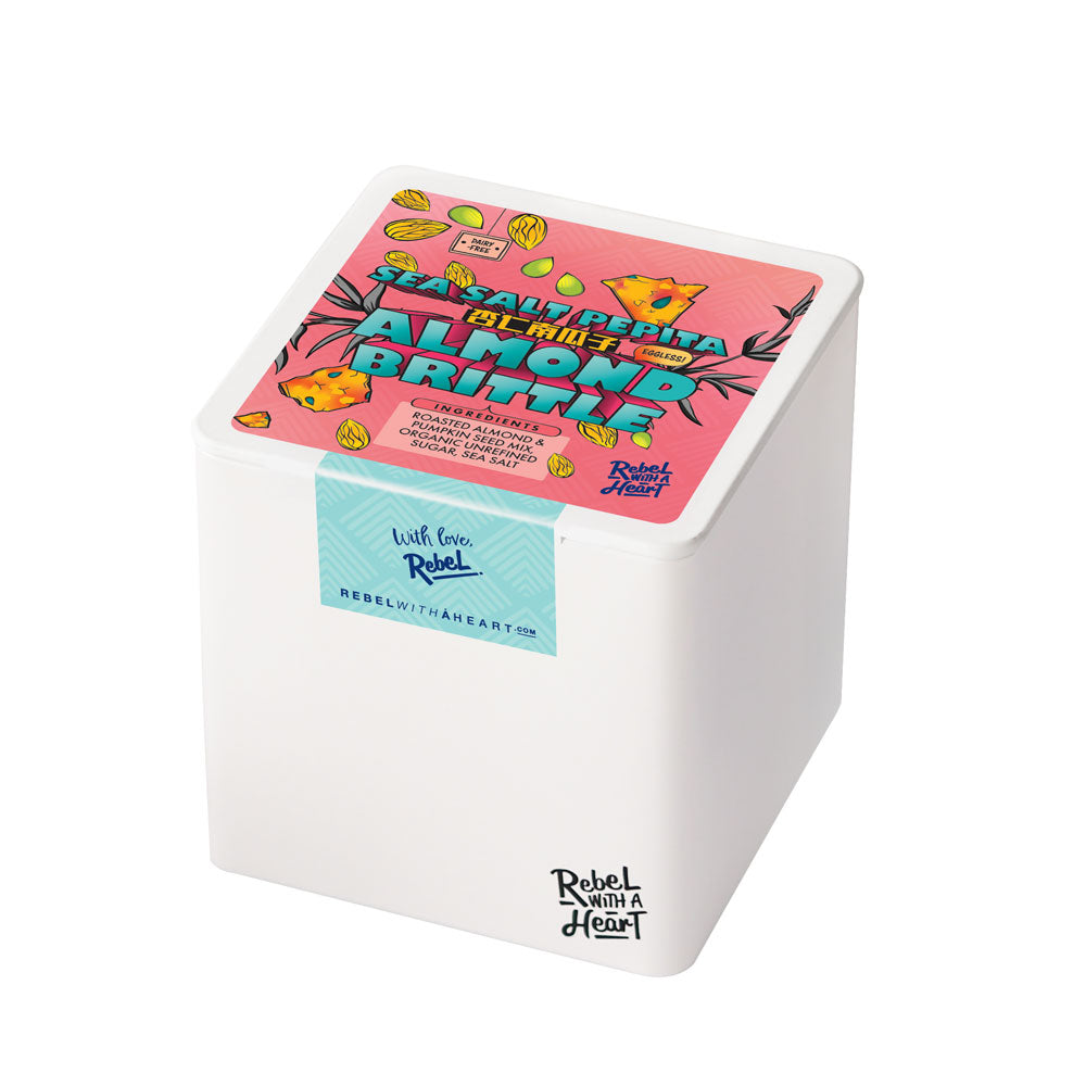 Inspired by our local traditional nut candy. Caramelised cane sugar and a dash of sea salt is cooked into a sweet and savory liquid gold that a mixture of pepita and chopped almond gets tossed into. A pair of strong arms are then required to quickly roll the concoction into thin golden crisps. A perfect balance of sweet and salty, these delectable brittles consist of a smoky aroma and an irresistible crunch.